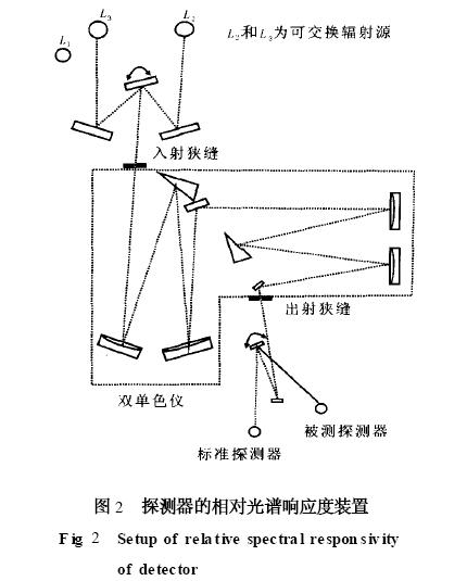 相对光谱响应度测量用的传递标准是非选择性的腔形热电堆, 为了保持它的非选择性, 热电堆必须在窗口外操作。但由于没有窗口, 探测器随外界空气波动很灵敏, 它将产生一个毫瓦级的等效噪声功率。为了准确测量, 必须提供几十毫瓦的辐射功率, 该辐射功率对双单色仪来说是不能接受的。如果使用单个单色仪, 则将会产生大量的杂散辐射, 但不会影响测量准确度, 因为被校准的热电堆与腔探测器一样无选择性。